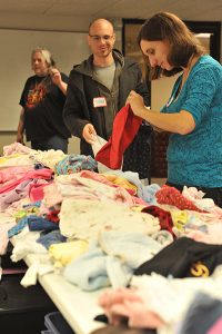 Each year the Breakfast with Baby program distributes between 36,000 – 45,000 diapers. The program offers more than just diapers. We invite the parents to sit down with us and their families for a hot breakfast. Afterwards, parents can pick out free gently-used baby clothes, toys, strollers, knitted items, blankets, whatever we have on hand. And, of course, receive a package of diapers for each eligible child.