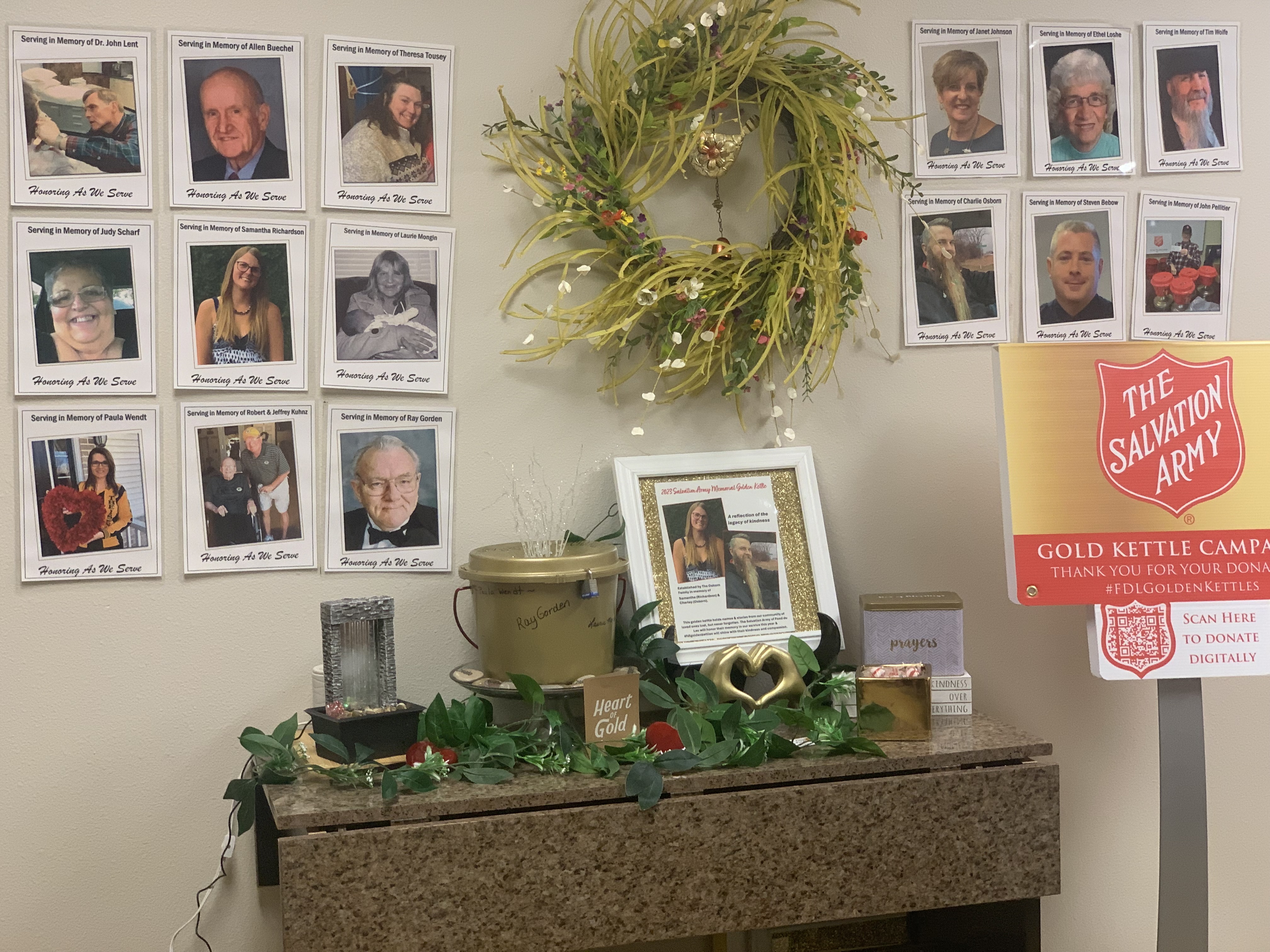 A: The Osborn Family established the Golden Kettle Legacy Memorial, and raises funds through a match they put forward during the annual Bucket Brigade, a special kettle collection sponsored by KFIZ and 107.1 The Bull. Family, friends and co-workers of those memorialized on the Golden Kettle often choose to contribute, ring bells alongside a Golden Kettle at Christmastime, volunteer alongside us in memory of their special someone throughout the year, and remember us in their prayers. Each is a blessing!