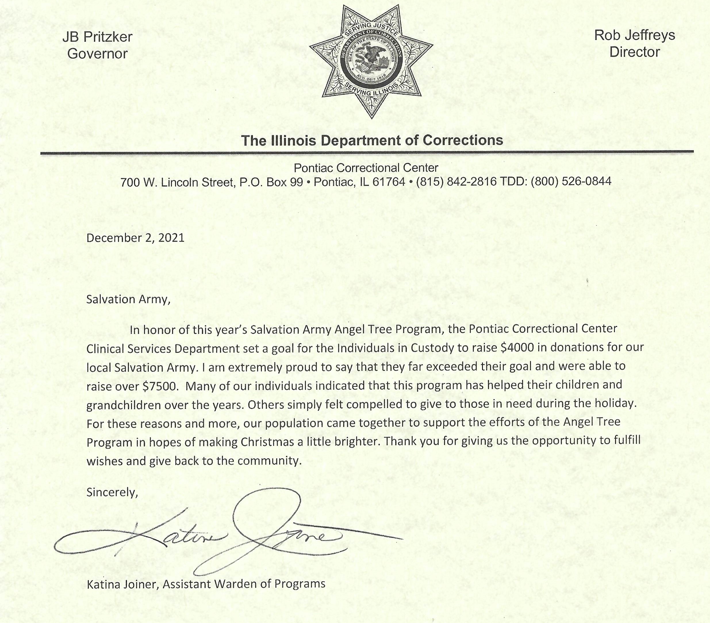 The Salvation Army Heartland Division thanks everyone involved with this special holiday giving opportunity from the Pontiac Correctional Center. Our mission is blessed to have supporters in every local community that believe in the services and programs we provide to those in need, and this gift in particular offers inspiration for us and others. Ensuring that everyone has the ability to give has created a truly special Christmas moment for the families in Pontiac that The Salvation Army will never forget!