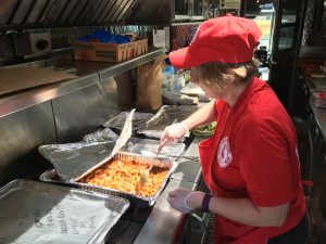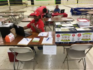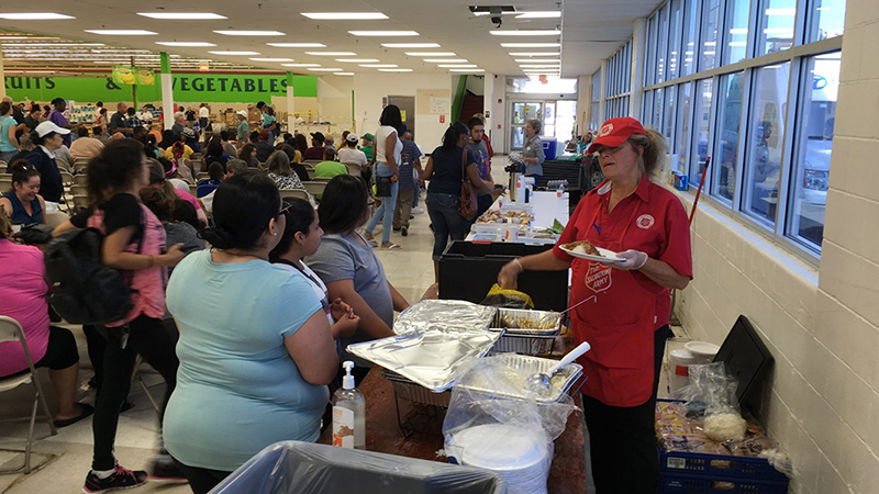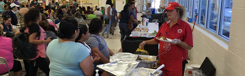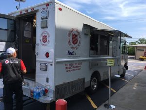 Salvation Army EDS was asked to provide a hot lunch for all the families that would be coming to receive relief. CM117 our mobile feeding kitchen was deployed to the MARC location. EDS Volunteer Donna Ceglarek and EDS Staff member Michele Kushner preparing and served a hot lunch for hundreds of families.