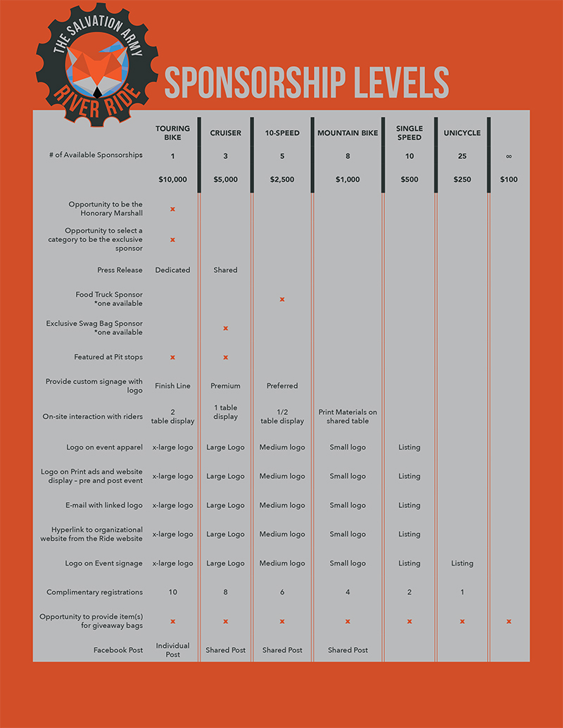 We are again offering area companies the opportunity to support The Salvation Army’s vital programming through sponsorship of this important event. Contributing to The Salvation Army River Ride supports life-changing services while offering companies a variety of marketing and promotional benefits. With several sponsorship options available at a range of giving levels, we have an option that is just right for businesses of all sizes.
