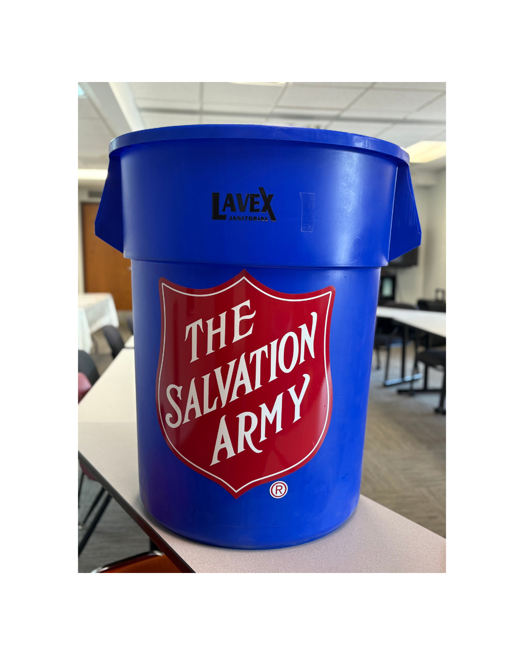 The pictured blue barrel is for donated items. Place your donated items in the barrel to be collect several times a week.