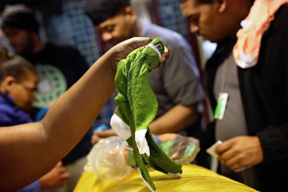 Socks knitted by a small group of disadvantaged women in Congo are warming the feet of hundreds of men and women served at The Salvation Army Harbor Light Center in Minneapolis. The socks were distributed there Thursday, March 20.