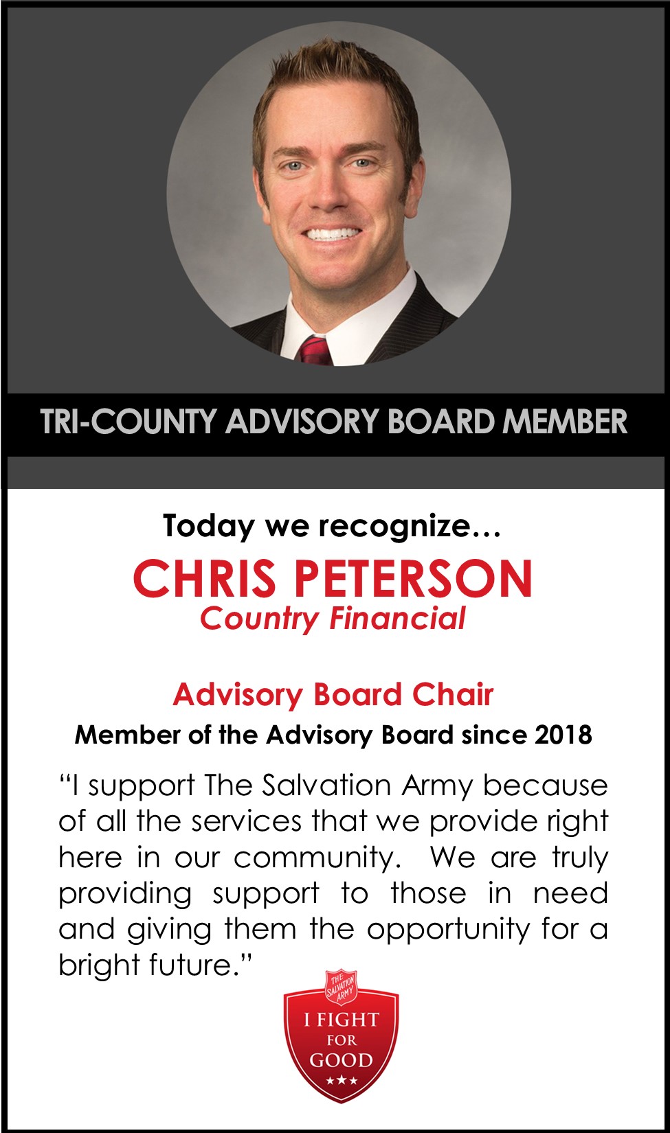 The Salvation Army's mission has many moving parts that come together in our successful moments in Doing The Most Good for the Peoria area communities. A major part of our services and programs that help local neighbors in need, is the compassion and dedication of our Advisory Board members - whose service aims to create a real difference for their communities. These members care for those who are struggling to make ends meet around them. That is why they choose The Salvation Army, because they have seen what our work can do for those in need. We are grateful for their trust in our work and the impacts they create under the guidance of our Advisory Board Chair Chris Peterson, of Country Financial. He is able to use leadership and engagement to achieve so much with our other board members. Thank you, Chris, for all you do!