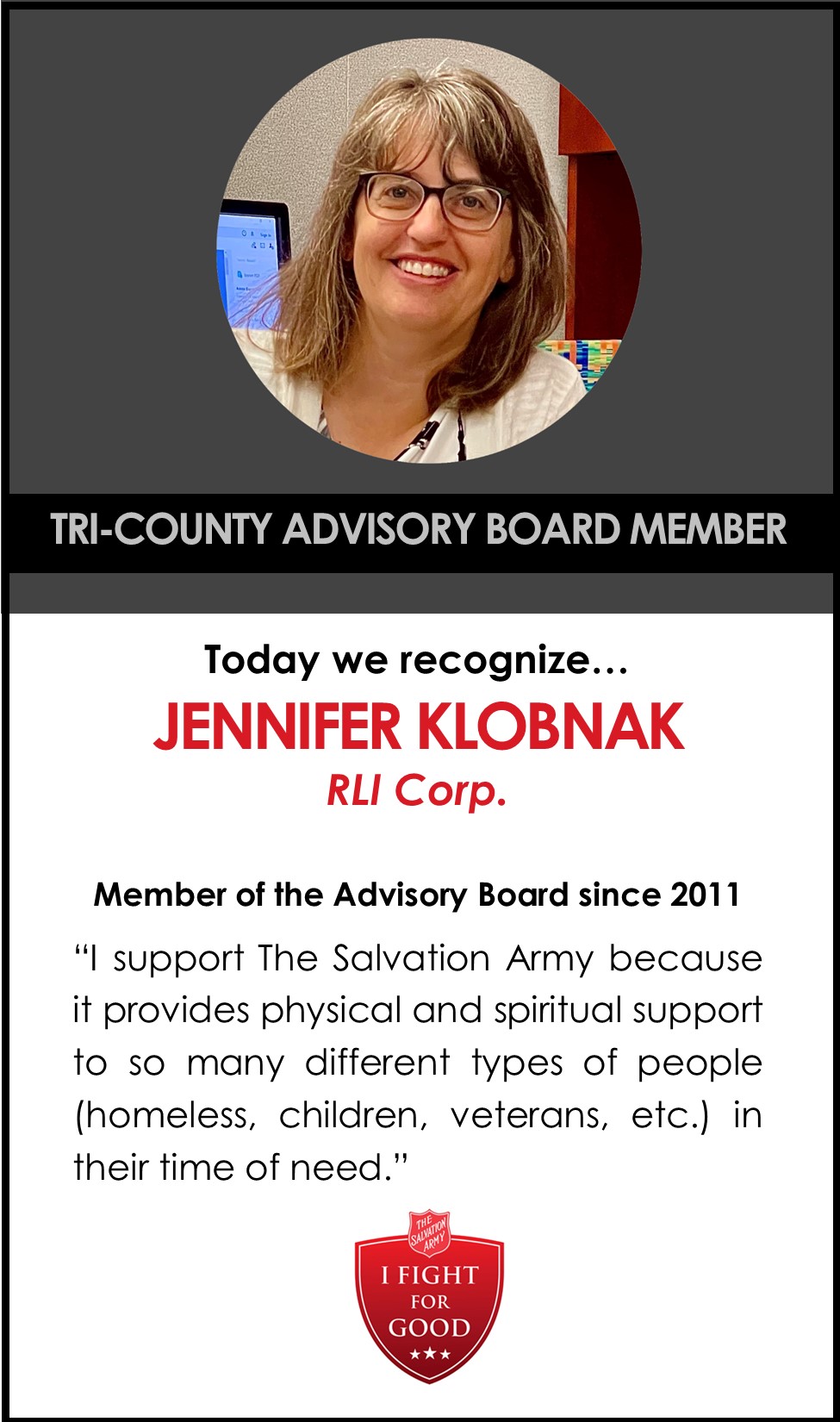 The members of the Tri-County Advisory Board embody this pairing of compassion and action by working with us at The Salvation Army every day! Together, with their support, we are able to Do The Most Good for those people in the local Tri County communities who are struggling with daily hardships. Through our board members' leadership, support, and compassionate actions for others, they make a real difference every single day. We truly appreciate board members, such as Jen Klobnak who are bringing our mission to life for their neighbors in need. Thank you for all you do for The Salvation Army and our community members.