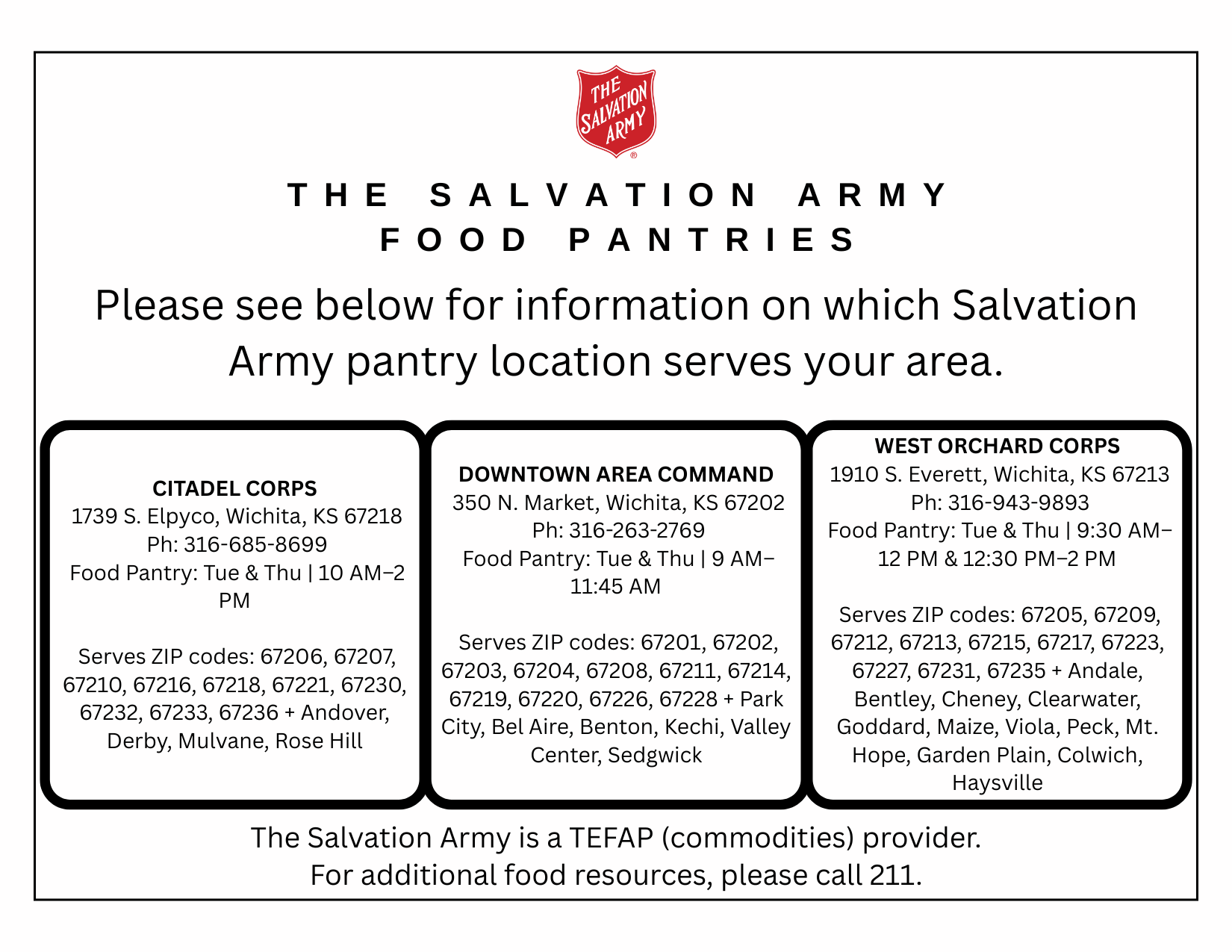 Our on-site pantry provides supplemental food once per month for individuals and families in need. Please call (316) 263-2769 if you need more information. Our food pantry is a TEFAP commodities provider.